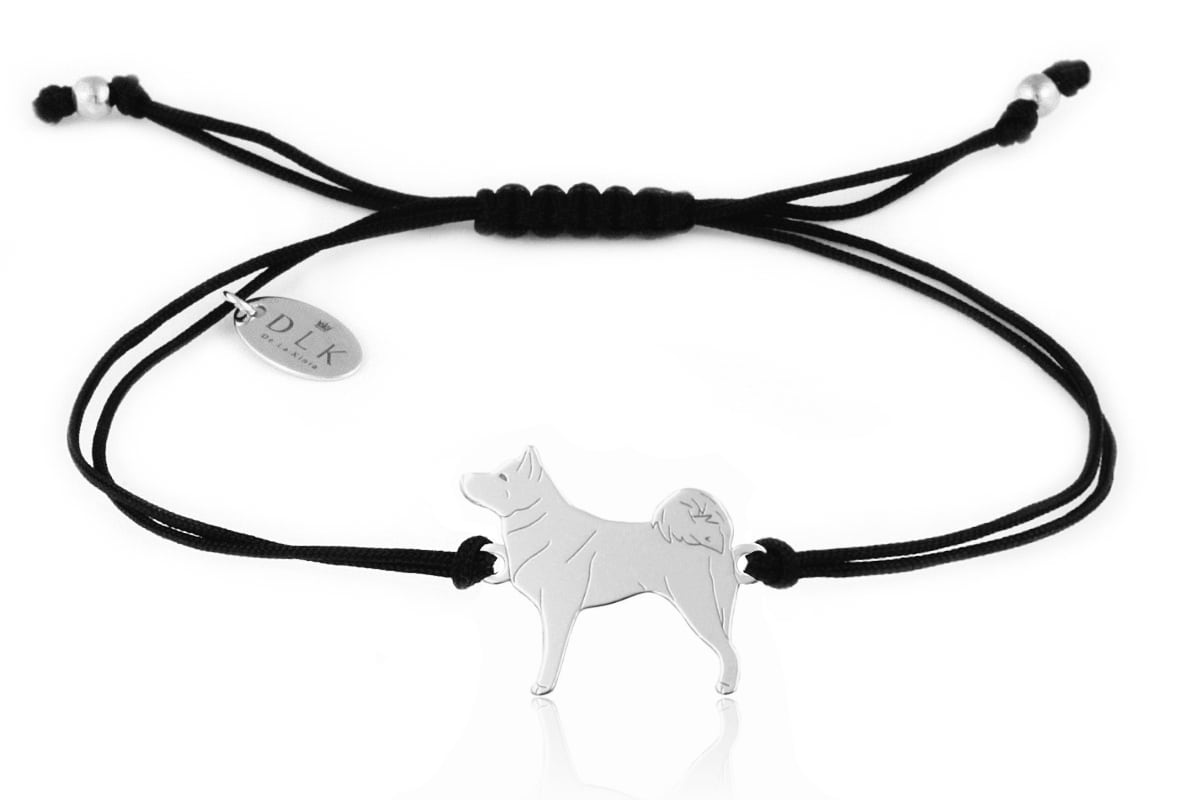Bransoletka wykonana jest z łącznika w kształcie sylwetki psa ze srebra (próba 925) oraz z czarnego sznurka. Bransoletkę sznurkową dodatkowo ozdabiają srebrne elementy – kulki i zawieszka DLK ze srebra próby 925. Tak wysoka próba srebra oznacza, że srebro nie uczula, a wręcz przeciwnie, posiada właściwości bakteriobójcze, antywirusowe i antygrzybicze.