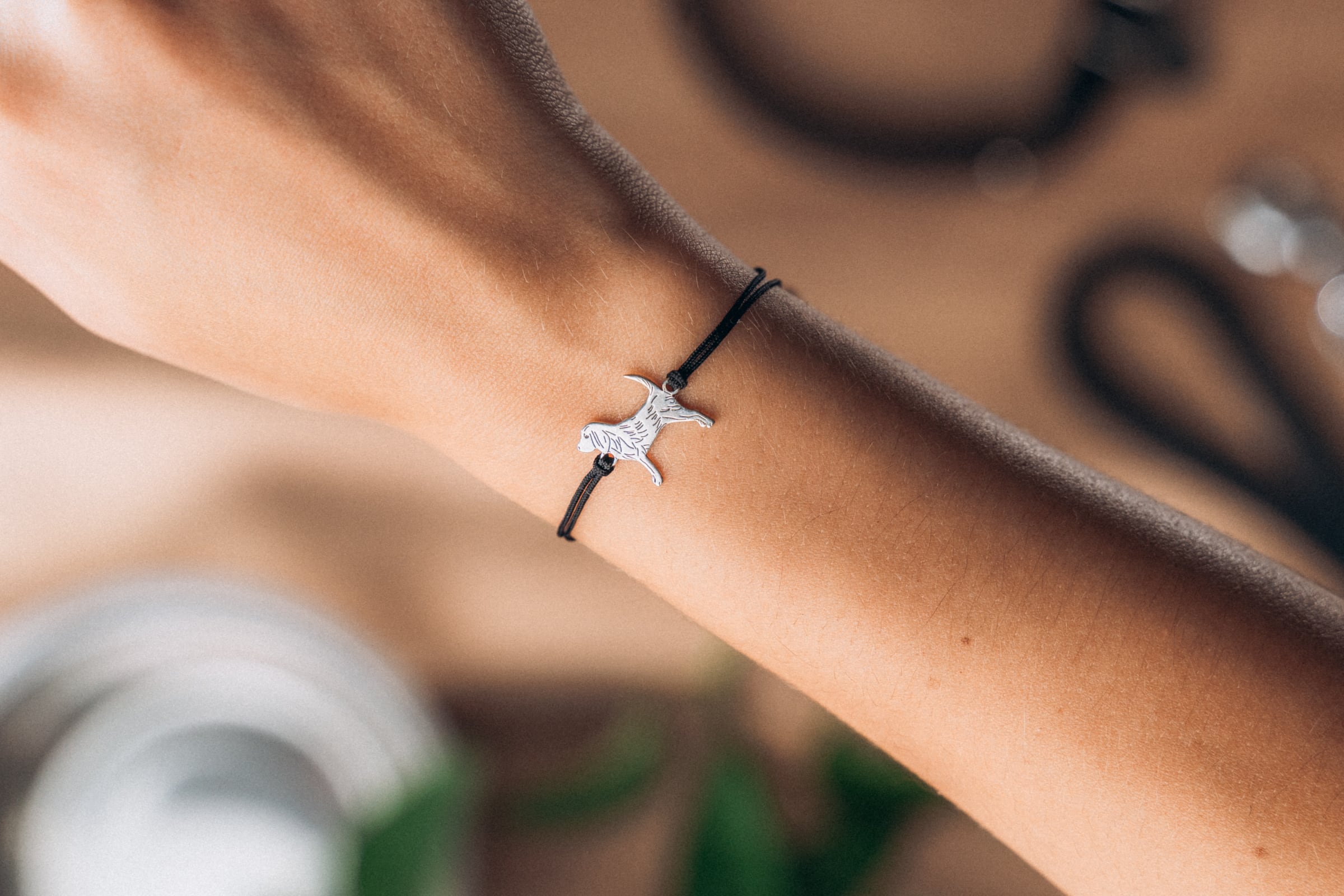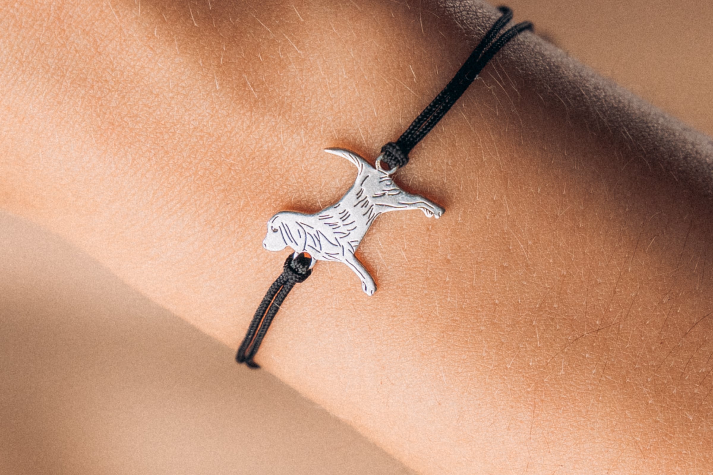 Bransoletka wykonana jest z łącznika w kształcie sylwetki psa ze srebra (próba 925) oraz z czarnego sznurka. Bransoletkę sznurkową dodatkowo ozdabiają srebrne elementy – kulki i zawieszka DLK ze srebra próby 925. Tak wysoka próba srebra oznacza, że srebro nie uczula, a wręcz przeciwnie, posiada właściwości bakteriobójcze, antywirusowe i antygrzybicze.