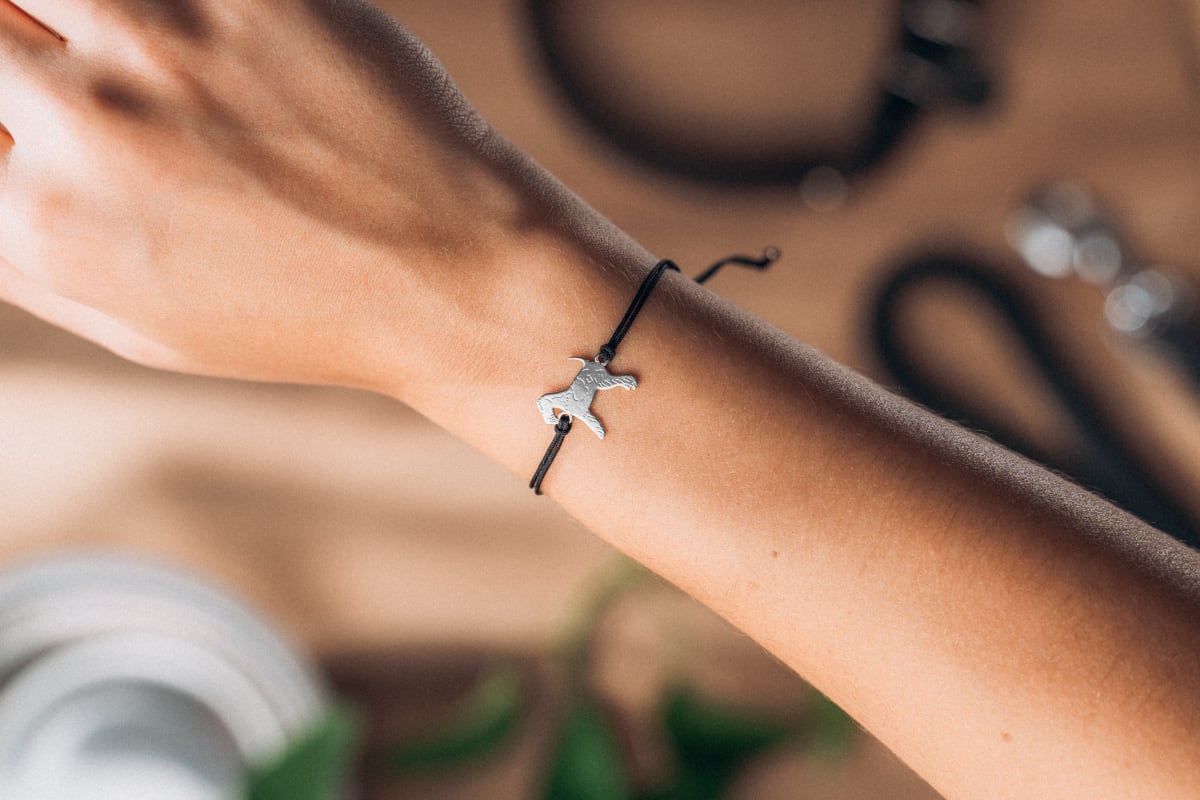 Bransoletka wykonana jest z łącznika w kształcie sylwetki psa ze srebra (próba 925) oraz z czarnego sznurka. Bransoletkę sznurkową dodatkowo ozdabiają srebrne elementy – kulki i zawieszka DLK ze srebra próby 925. Tak wysoka próba srebra oznacza, że srebro nie uczula, a wręcz przeciwnie, posiada właściwości bakteriobójcze, antywirusowe i antygrzybicze.
