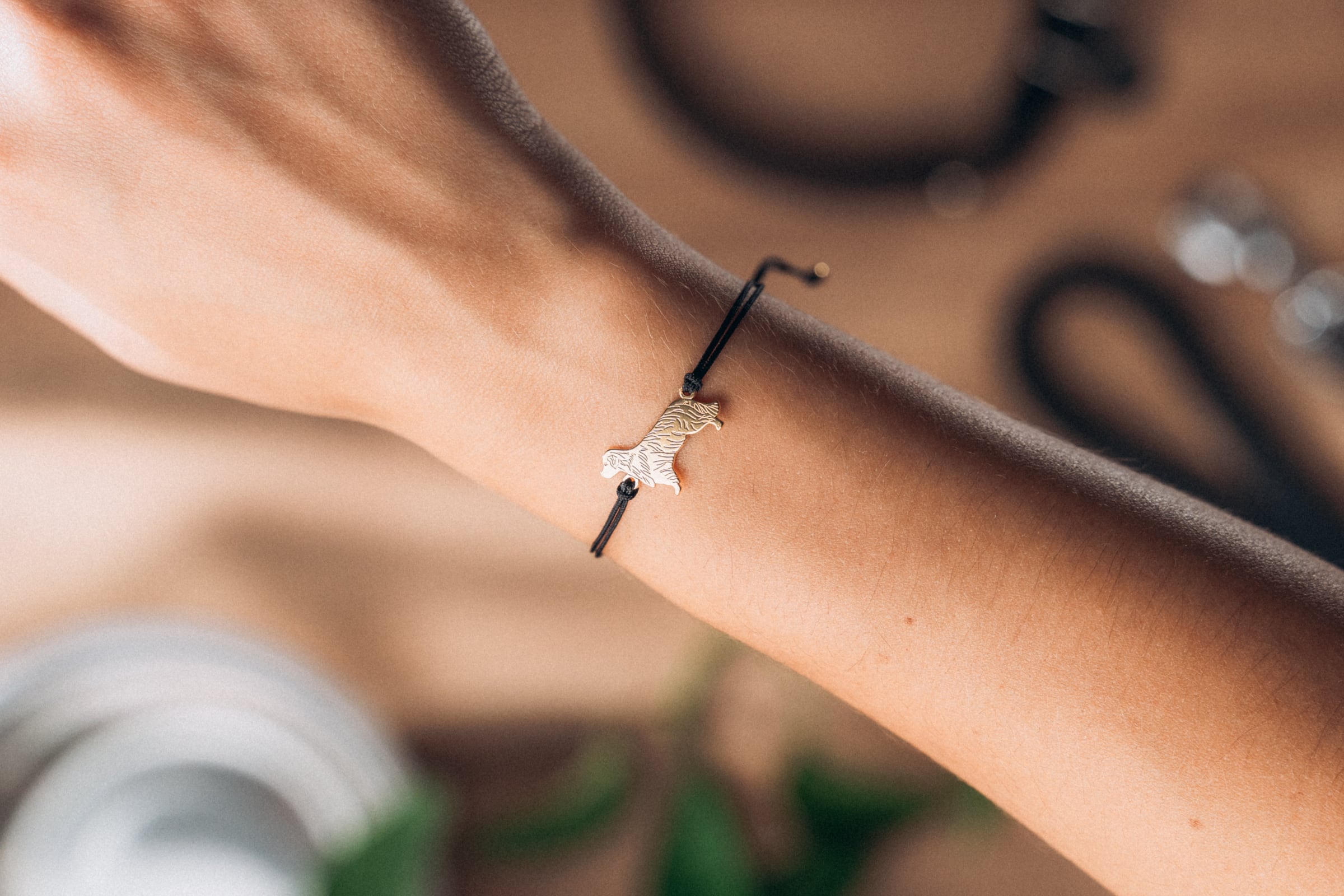 Bransoletka wykonana jest z łącznika w kształcie sylwetki psa z pozłacanego srebra (próba 925) oraz z czarnego sznurka. Bransoletkę sznurkową dodatkowo ozdabiają złote elementy – kulki i zawieszka DLK ze srebra próby 925. Tak wysoka próba srebra oznacza, że srebro nie uczula, a wręcz przeciwnie, posiada właściwości bakteriobójcze, antywirusowe i antygrzybicze.