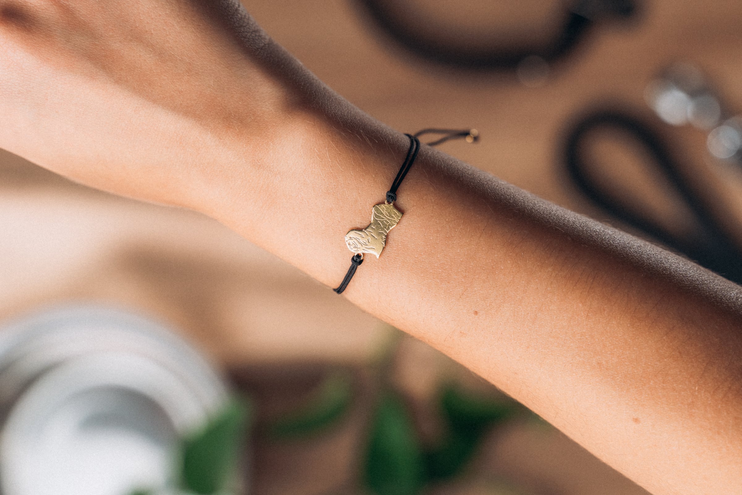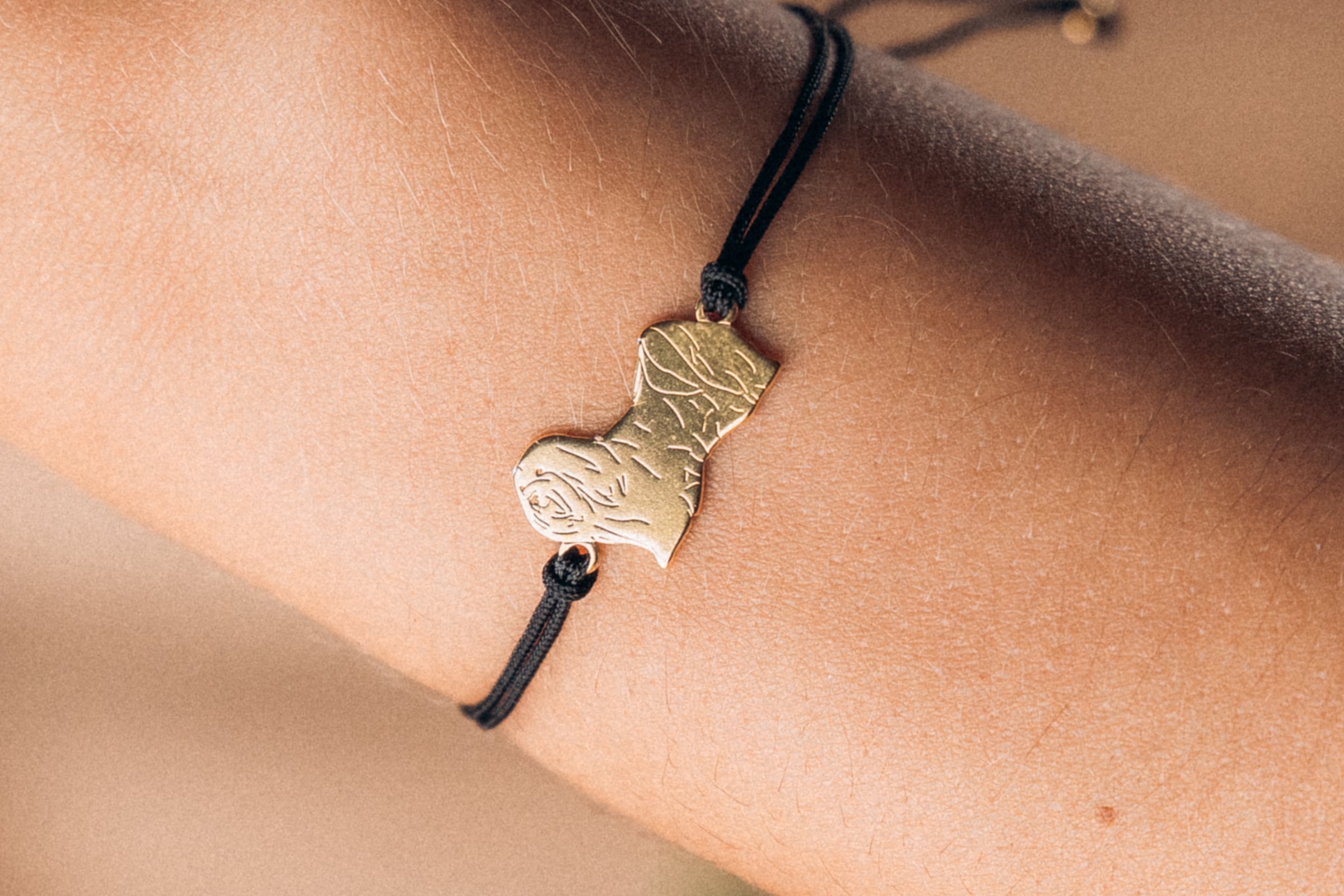 Bransoletka wykonana jest z łącznika w kształcie sylwetki psa z pozłacanego srebra (próba 925) oraz z czarnego sznurka. Bransoletkę sznurkową dodatkowo ozdabiają złote elementy – kulki i zawieszka DLK ze srebra próby 925. Tak wysoka próba srebra oznacza, że srebro nie uczula, a wręcz przeciwnie, posiada właściwości bakteriobójcze, antywirusowe i antygrzybicze.