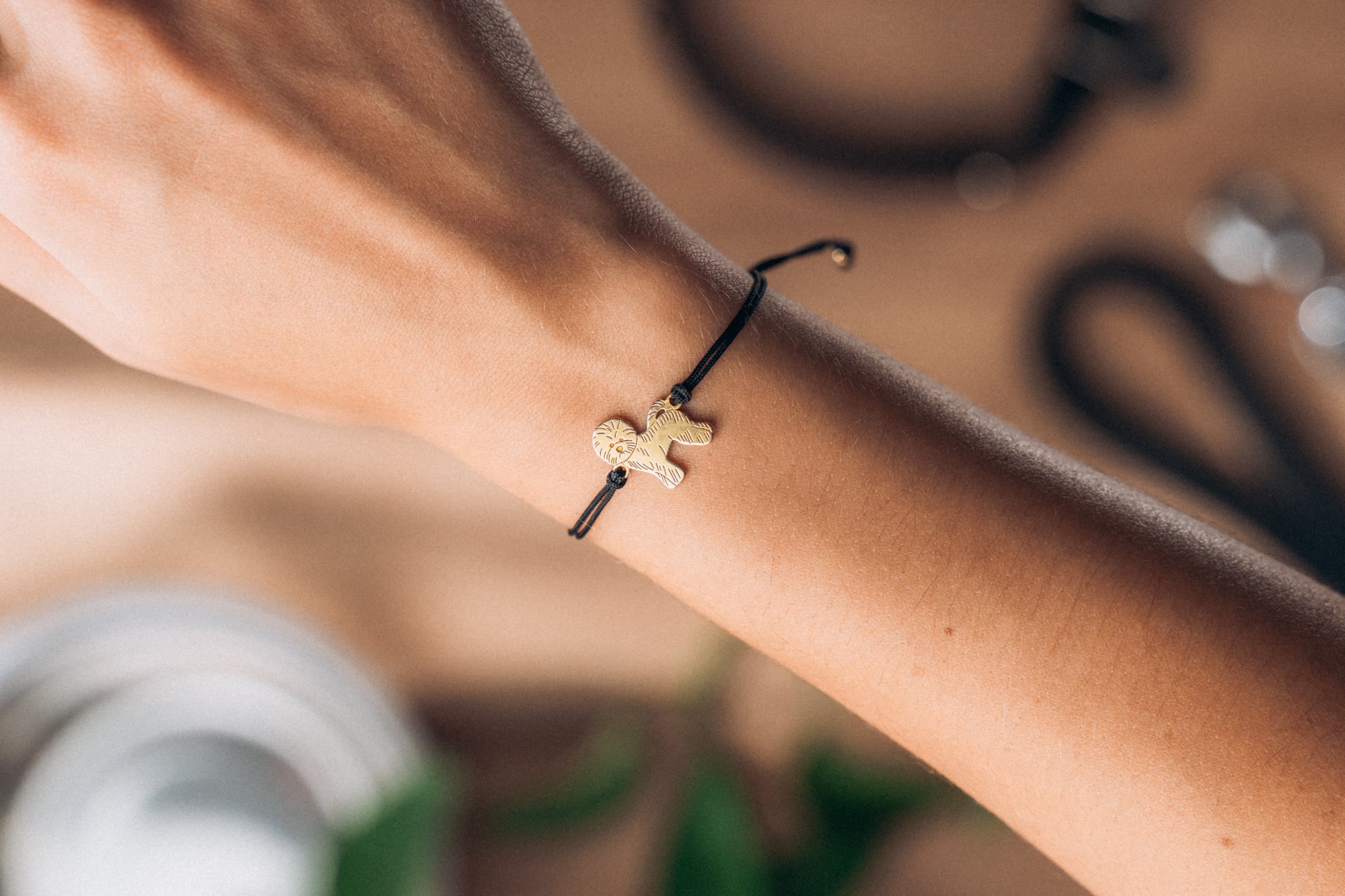 Bransoletka wykonana jest z łącznika w kształcie sylwetki psa z pozłacanego srebra (próba 925) oraz z czarnego sznurka. Bransoletkę sznurkową dodatkowo ozdabiają złote elementy – kulki i zawieszka DLK ze srebra próby 925. Tak wysoka próba srebra oznacza, że srebro nie uczula, a wręcz przeciwnie, posiada właściwości bakteriobójcze, antywirusowe i antygrzybicze.