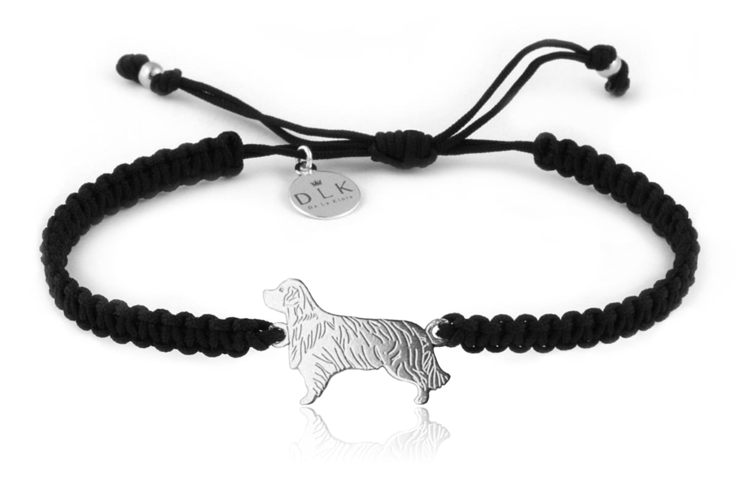 Bransoletka wykonana jest z łącznika w kształcie sylwetki psa ze srebra (próba 925) oraz z paska z czarnego, plecionego sznurka – makramy. Bransoletkę na makramie dodatkowo ozdabiają srebrne elementy – kulki i zawieszka DLK ze srebra próby 925. Tak wysoka próba srebra oznacza, że srebro nie uczula, a wręcz przeciwnie, posiada właściwości bakteriobójcze, antywirusowe i antygrzybicze.