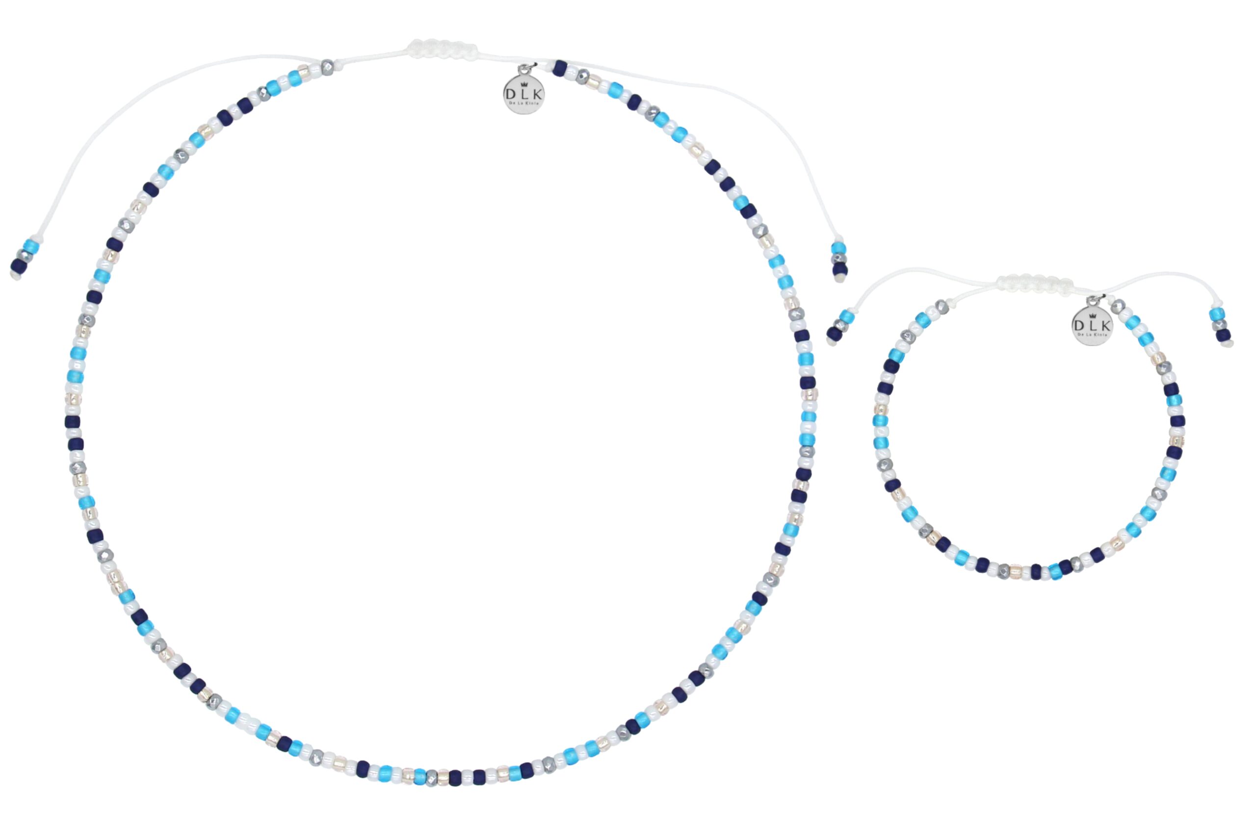 Naszyjnik i bransoletka osadzone są na regulowanym sznurku, co zapewnia idealne dopasowanie zarówno na dekolcie, jak i na nadgarstku: